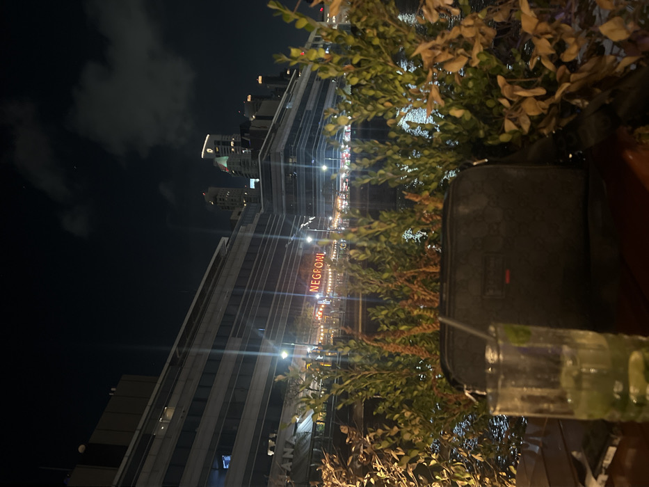 A nighttime view showcases buildings with illuminated signs, including "NEGRONI." Foliage partially obscures the buildings. In the foreground, a drink with a straw sits on a surface, accompanied by a patterned black bag. The sky is dark with clouds. The buildings appear to be modern architectural designs.