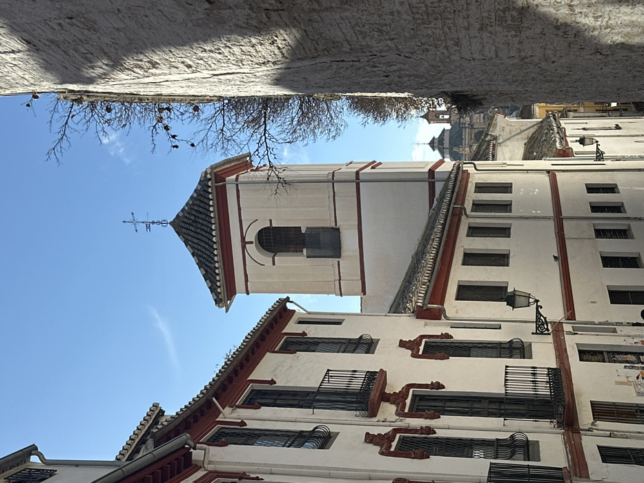 The scene captures a narrow, descending street in the Albaicín neighborhood of Granada, Spain, under a clear blue sky. The prominent structure is the white-stuccoed bell tower of the Iglesia de San José, situated on the left-midground. This tower features red trim, a pyramidal tiled roof, an arched belfry with a dark grate, and a finial incorporating a cross and weather vane. Adjacent to and partially in front of the tower, a multi-story building lines the left side of the street. This building displays white stucco facades with dark red decorative trim, tiled roofs, and multiple windows fitted with dark grates. Two upper-level windows are fronted by wrought-iron balconies. An ornate dark green street lamp with a glass lantern is mounted on the building's wall. On the far right, a tall, roughly textured stone wall defines the street's edge, partially illuminated by sunlight and casting distinct shadows. Beyond the immediate buildings, the street continues to descend, revealing glimpses of additional white-walled structures. In the distant background, the bell tower and dome of the Church of Santa Ana y San Gil are discernible against the horizon. Bare tree branches, some bearing dark, spherical seed pods, are visible emerging from behind the main church tower and along the right stone wall. No individuals, animals, or vehicles are present in the observable environment. The entire scene is illuminated by strong, directional sunlight.