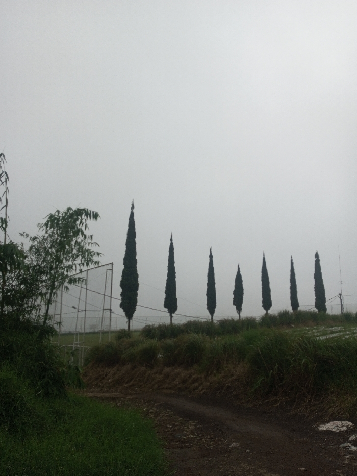 The image displays an outdoor scene in Irupalai, Sri Lanka, characterized by heavy overcast conditions or fog, rendering the sky a uniform light grey. In the foreground, a dark dirt path curves from the bottom center towards the middle right. To the left of the path, dense green grass and low vegetation are visible, while to the right, a slight embankment supports drier, brownish vegetation. The midground features a prominent line of seven tall, slender, dark green coniferous trees, likely cypress, standing erect and somewhat evenly spaced, extending horizontally across the frame. The leftmost tree in this line is the tallest. Behind these trees, particularly on the left, a white or light-colored fence structure, possibly part of a sports field or enclosure, is partially discernible. Further to the right, beyond the line of trees, a cultivated field with discernible rows appears in the muted light. No people or active subjects are present.
