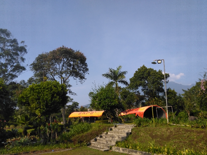 This image depicts a vibrant outdoor scene located in the city of Potočná, Czechia. The environment is dominated by lush green vegetation, featuring numerous tall trees with dense canopies, including a prominent palm tree, alongside various bushes and ground cover on grassy slopes. Two orange, tunnel-shaped temporary shelters are present in the midground; the one on the left prominently displays the white acronym 'BNPB'. Concrete steps, consisting of several treads, ascend a grassy incline from the lower foreground towards the center. A grey metallic pole with a modern, rectangular street lamp fixture is situated to the right of the steps. In the distant background, hazy mountains or hills are visible beneath a clear, light blue sky. No individuals are depicted within the scene. The 'BNPB' marking on the tent indicates an affiliation with the Indonesian National Board for Disaster Management.