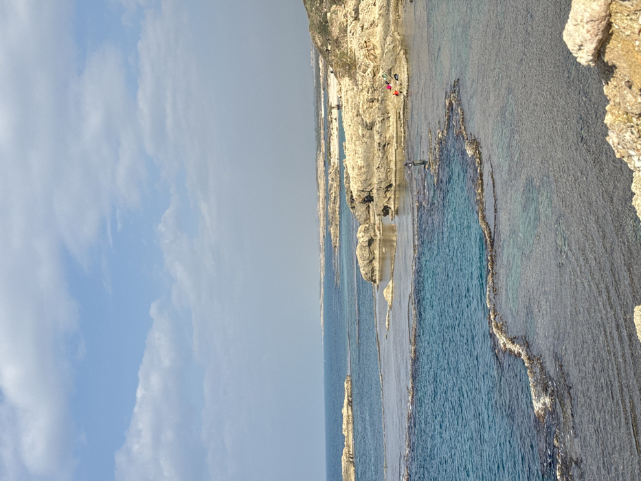 This image presents a coastal landscape within the Hof HaCarmel Regional Council, Israel, under a sky with scattered white clouds. The foreground and mid-ground consist of a rugged shoreline composed of light-colored, stratified rock formations that extend into the Mediterranean Sea. The water exhibits varying depths and shades of blue and turquoise, forming natural pools and shallow intertidal zones around the rocky outcrops. In the mid-ground, a lone individual wearing dark clothing is observed standing in a shallow water channel, actively engaged in fishing with a visible rod extending over the water. To the right of this individual, on a higher, sunlit rocky outcrop, a small group of at least three persons are seated or resting; some of these individuals are wearing brightly colored garments, specifically red and pink. The coastline recedes into the distance along the right side of the frame, characterized by further rocky terrain interspersed with areas of sand, where additional, indistinct human figures are faintly discernible near the waterline. The sea surface appears calm.