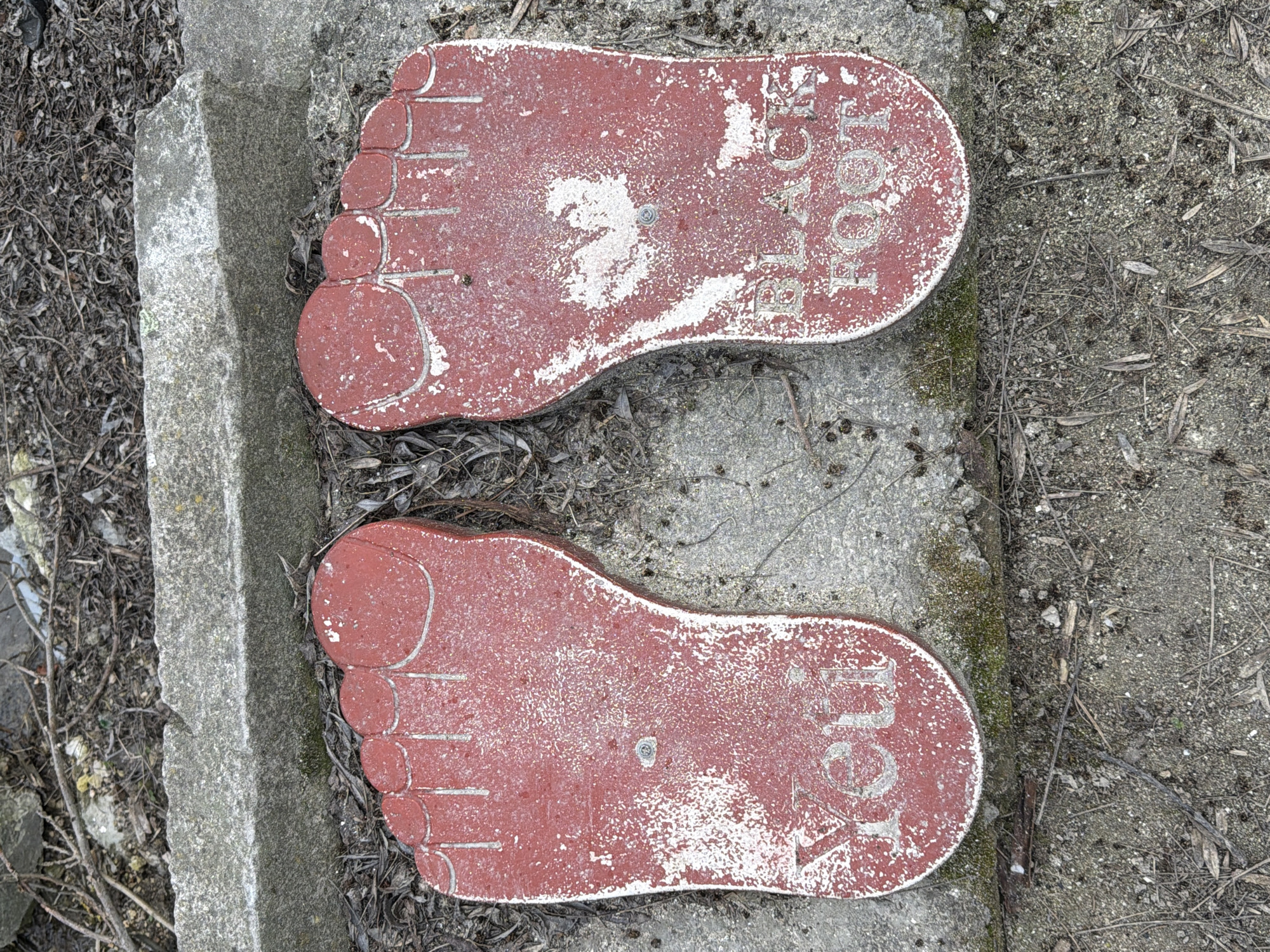 Two weathered, red, foot-shaped markers are depicted on the ground in the city of Kavarna, Bulgaria. Each marker is made of a solid material, exhibiting significant red paint loss that reveals a lighter base. White lines delineate the toes and the perimeter of each foot. The left foot marker, positioned to the viewer's left, displays the word "Yeti" in white capital letters near its heel. The right foot marker, positioned to the viewer's right, displays the stacked words "BLACK FOOT" in white capital letters near its heel. A small, round, metallic fastener is embedded in the arch area of both markers. These two markers are arranged side-by-side, pointing away from the viewer. They rest on a surface composed of light gray concrete paving and dark, dry, granular soil mixed with scattered dry leaves, twigs, and small stones. Immediately behind the markers, a weathered, light gray concrete curb or block is visible, separating the immediate foreground from a patch of unkempt earth and organic debris.