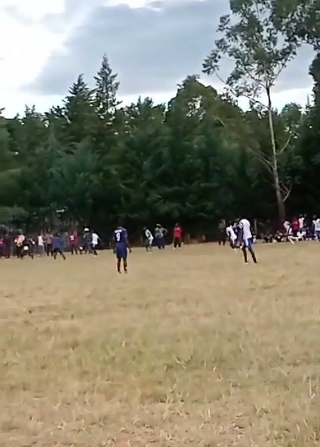 The video depicts a soccer game in progress on a dry, grassy field, with a line of spectators along one side
