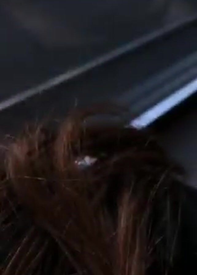close-up view of a person with reddish-brown hair. The camera angle is low, looking up at the person. The background is blurry and appears to be the interior of a car, with a roof and part of a window visible.