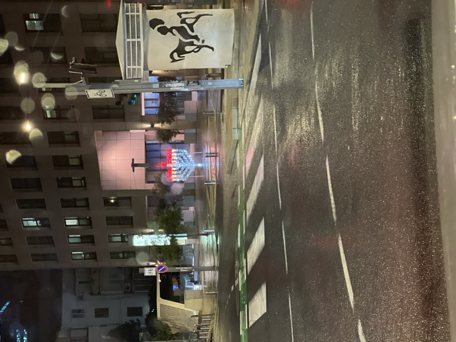 An outdoor nighttime scene depicts a wet city street with zebra stripes for a pedestrian crossing. A modern building rises on the left, featuring a decorative menorah-like light display. A street sign with a black silhouette of a running figure is mounted on a pole with traffic lights. Bokeh effects blur lights in the image, suggesting raindrops on a lens.