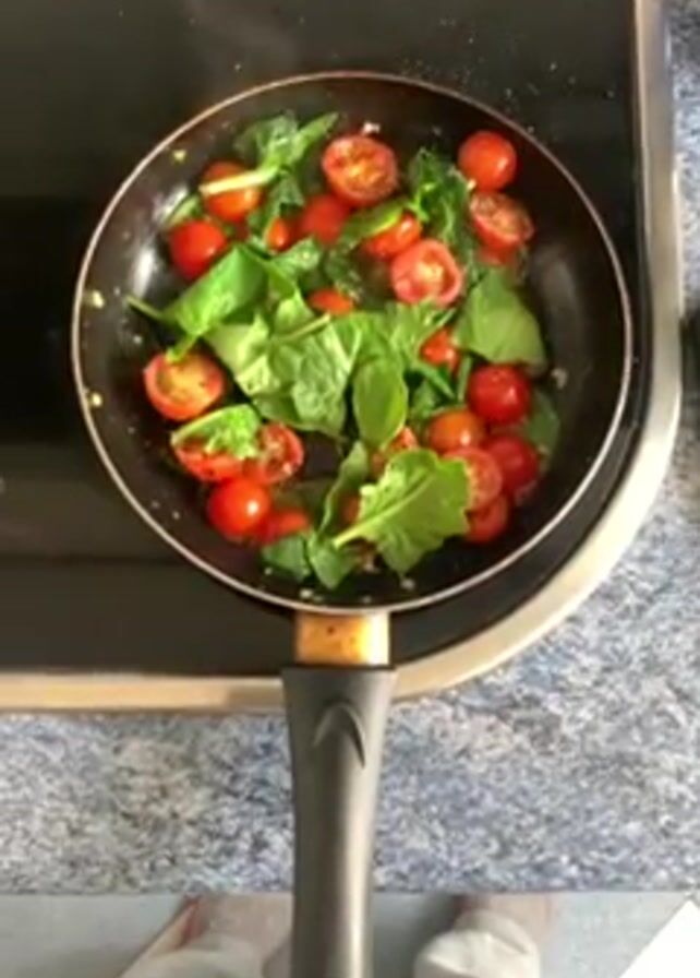 - "A pan of halved cherry tomatoes and spinach is cooking on a black glass-top stove" by FM-f6C8p2, licensed under CC BY 4.0