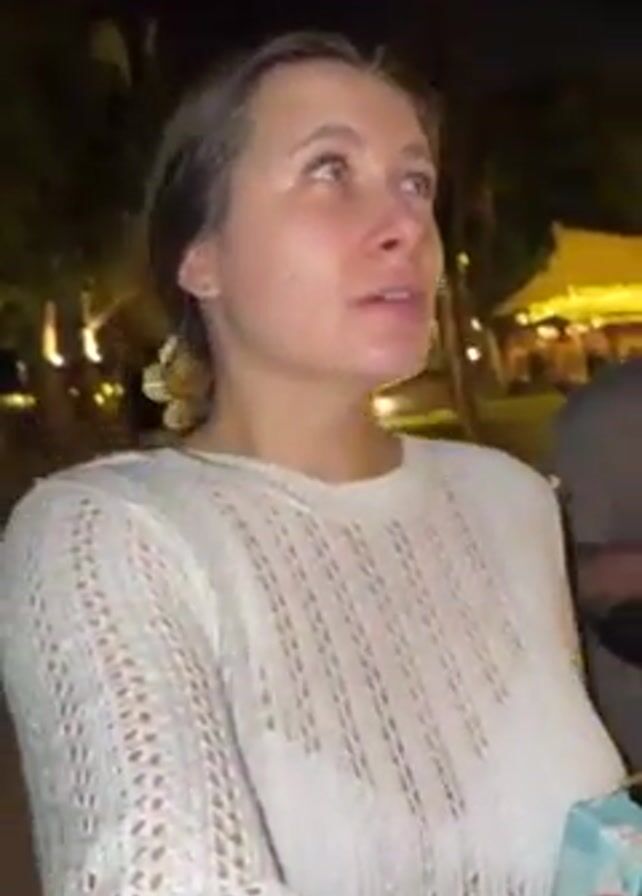 A woman with her hair pulled back is drinking from a small, light blue juice box with a straw while walking through a park at night. She’s wearing a white, knit sweater. Behind her, slightly out of focus, a man is pushing what appears to be a stroller. The park has walkways and green areas with trees. Some buildings with yellow lighting can be seen in the background. The overall lighting is dim, highlighting the woman’s face and attire.