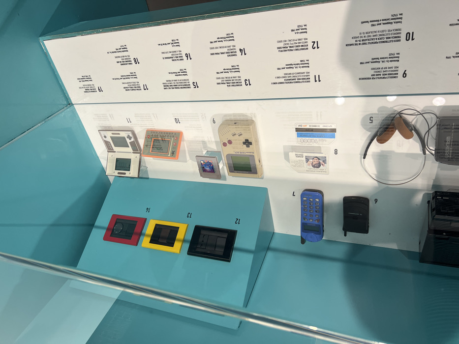 This image depicts an exhibition display case, likely situated in a museum or cultural institution in Milan, Italy. The environment features a clear top surface, reflecting ambient light and unseen elements, above a turquoise-blue back and side enclosure. Exhibits are arranged on a white horizontal surface, accompanied by numbered labels and descriptive Italian text panels on the right-hand wall. No individuals are present in the scene. The primary subjects are a collection of vintage electronic devices and related objects, presented for historical or design-focused viewing. From bottom to top, left to right, the displayed items include: * **Item 5:** A black Sony Walkman cassette player, partially visible, connected to a pair of silver-banded wired headphones with brown ear pads. * **Item 6:** A dark gray or black flip-style mobile phone. * **Item 7:** A blue candy bar-style mobile phone featuring an external antenna and a visible numeric keypad. * **Item 8:** Two plastic cards: one is an identification or prepaid card displaying a man's portrait, and the other is a blue phone or value card marked "LIRE 10000" with a barcode. * **Item 9:** A beige original Nintendo Game Boy console with a green LCD screen, shown with a game cartridge inserted. Adjacent to it is a separate gray game cartridge with colorful artwork. * **Item 10:** An orange, rectangular handheld electronic game with a grid display, identified as "Thief in the Garden" in its description. * **Item 11:** A white, hinged Nintendo Game & Watch handheld electronic game, displayed in an open position. * **Items 12, 13, 14:** Three vertically aligned, empty rectangular display frames, colored black (12), yellow (13), and red (14), identified as "Phase I Switch", "Phase II Switch", and "Phase III Switch" respectively in the Italian text. The objects are static, arranged deliberately for display purposes, with consistent overhead lighting illuminating the scene.