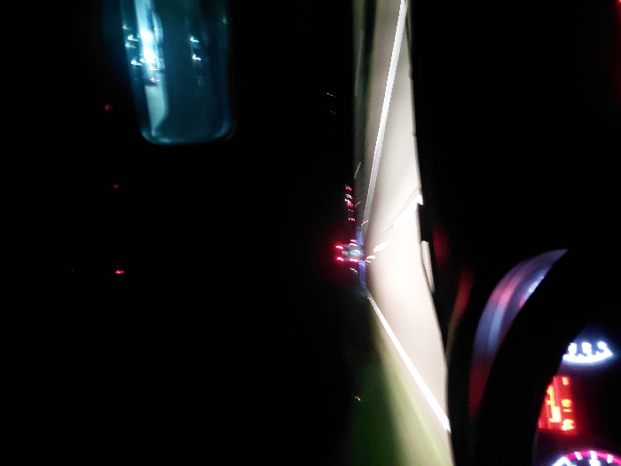 The image depicts a night scene from inside a vehicle. A dimly lit dashboard with red and white indicators is visible. The steering wheel partially obscures the view of a bright roadway illuminated by the headlights of the car. Headlights and taillights of other vehicles are seen in the distance. To the left of the roadway, a dark, blurred object, possibly a bottle, is present.