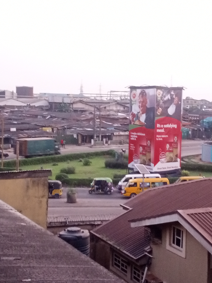 An elevated perspective showcases a bustling scene. In the foreground, rooftops vary in texture and color. A billboard for "satisfying meal" overlooks a busy street with vehicles, including vans and tuk-tuks. Buildings and rooftops stretch into the distance under a pale sky. Green spaces add a touch of nature, breaking up the urban landscape. A water tank sits atop a nearby building.