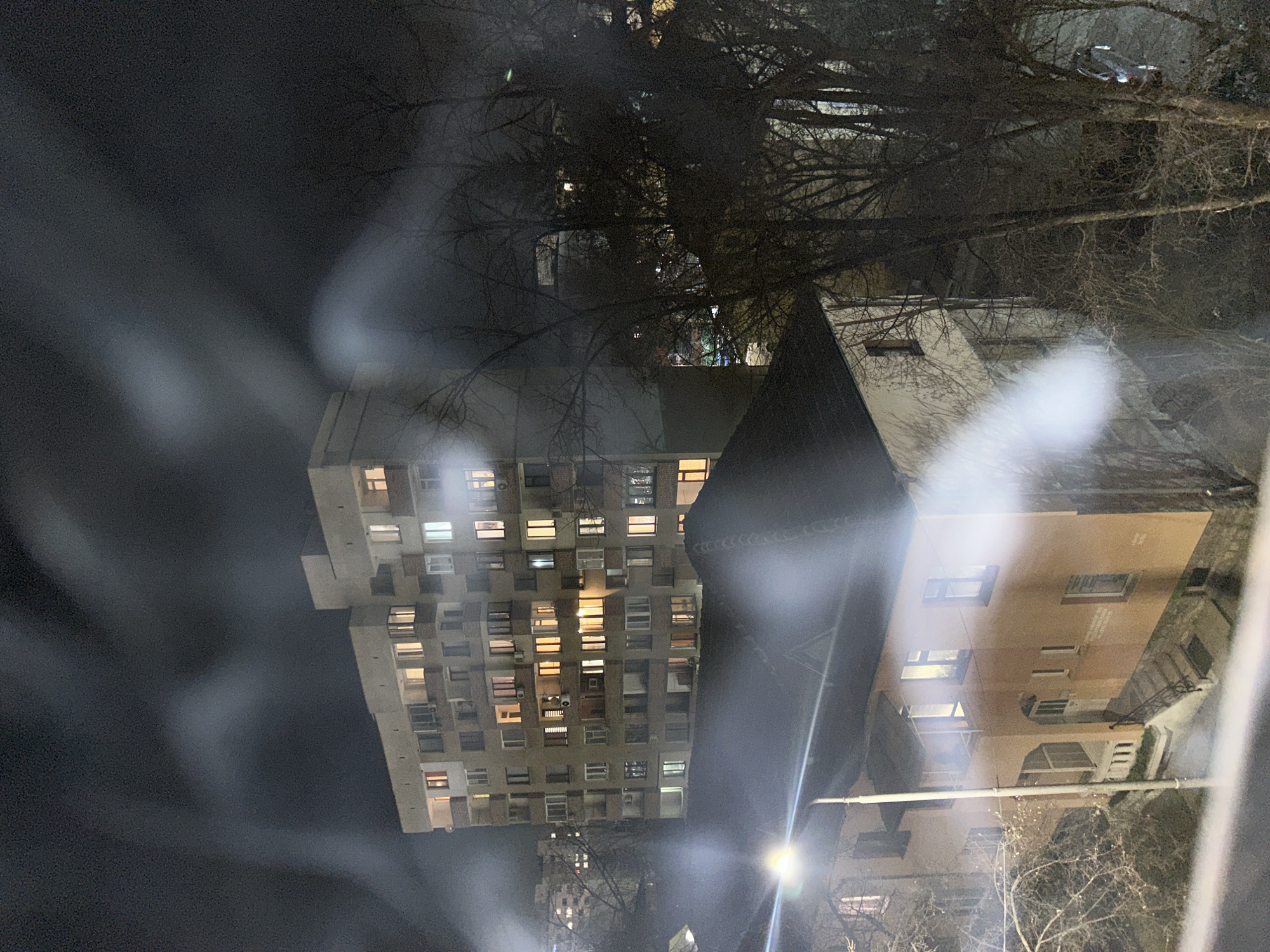 This image depicts an urban residential scene at night in Pernik, Bulgaria. The primary subject is a multi-story apartment building, approximately nine floors high, constructed of light-colored material, positioned centrally in the background. Numerous windows on this building emit warm yellow-orange and cool white light, indicating active interiors. Below and in front of the apartment building, a two-story house with an orange-beige facade and a dark sloped roof is visible on the left. A prominent streetlamp on a pole, emitting bright white light, is located in the mid-ground, slightly to the left of center, with visible light streaks and flares extending across the frame, particularly in the upper and lower portions of the image. To the right of the orange house, a portion of a lighter-colored, two-story building with a dark roof is partially obscured by bare deciduous trees. The foreground and the right side of the image are dominated by the silhouettes of leafless trees and branches. The sky is dark, indicating nighttime conditions. No individuals are visible.