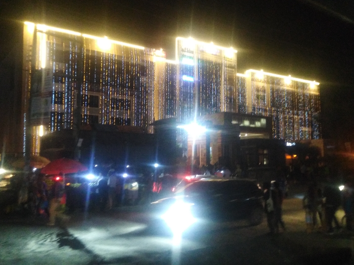 A nighttime image shows a large building adorned with numerous strings of lights. The building is multi-storied, with a prominent sign on top. Below, a crowd of people gathers near a road, with cars passing through. The headlights of a car shine brightly, creating a glare that obscures some of the details. The street appears wet, and the overall scene has a festive, illuminated atmosphere.