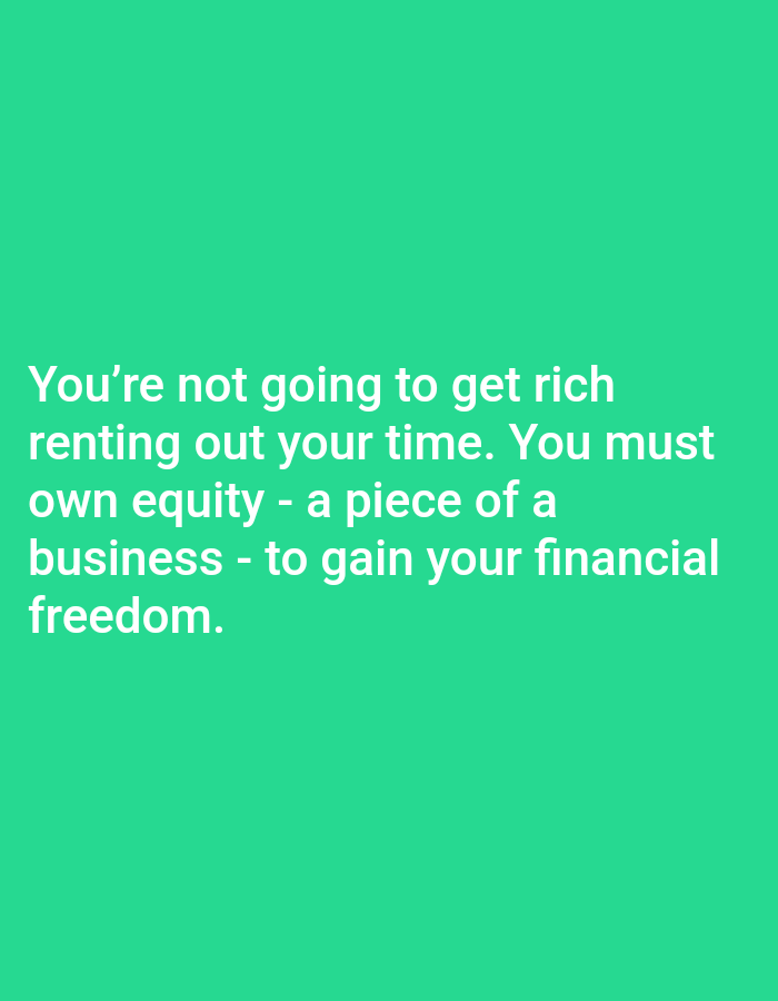 The image contains the following text: You're not going to get rich renting out your time. You must own equity - a piece of a business - to gain your financial freedom. The provided coordinates: latitude: 39.165, longitude: -85.739, are in Columbus, Ohio, United States. The image does not depict any people, objects, or actions. It contains a single text message.