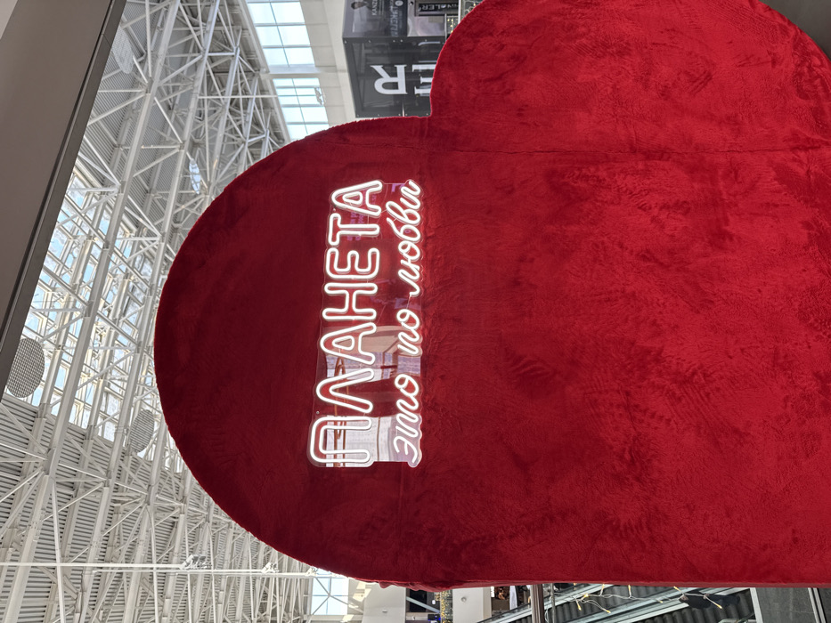 A large, red, heart-shaped display features a neon sign in Cyrillic script