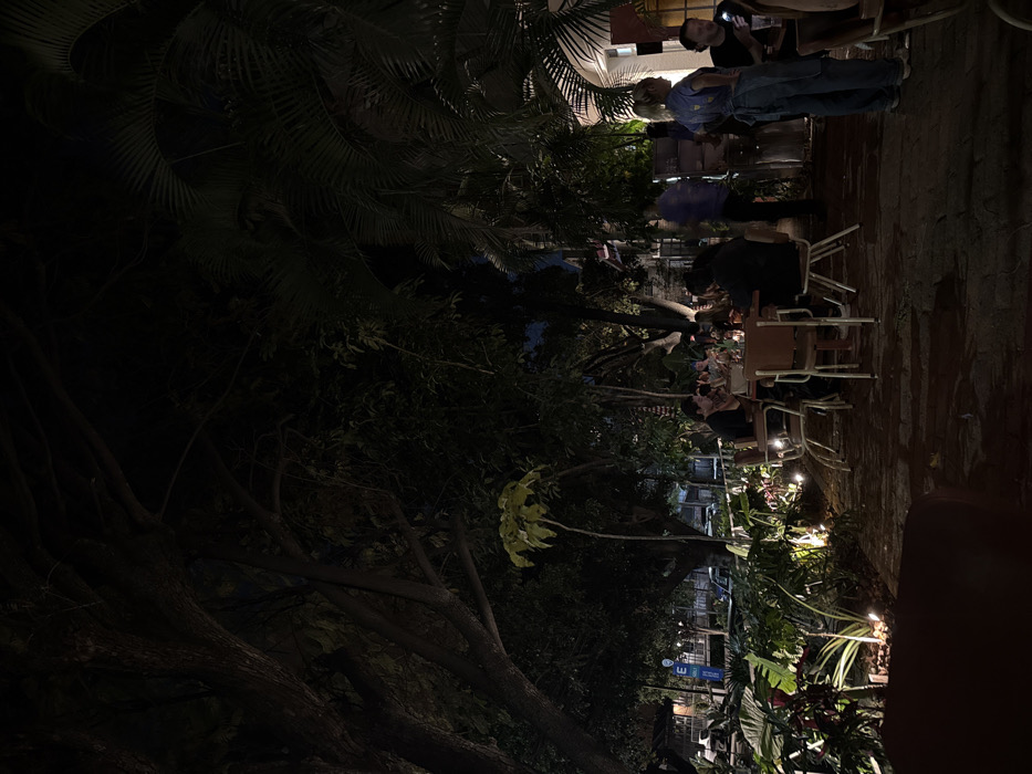 An outdoor restaurant scene at night, partially obscured by trees