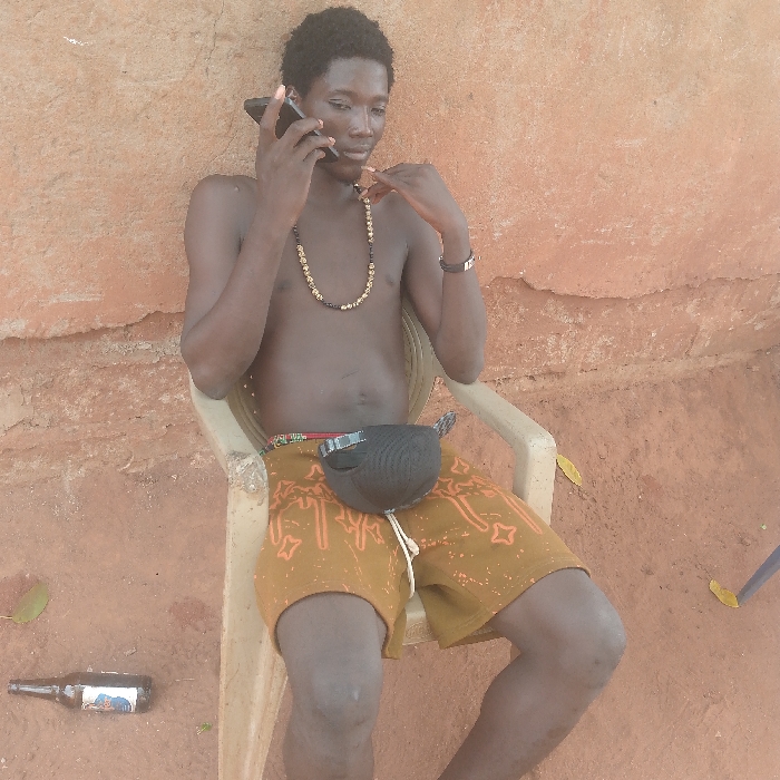 A topless dark-skinned man sits in a light-colored plastic chair, holding a cell phone to his ear. He wears orange and white patterned shorts with a black pouch resting on his lap. A beaded necklace adorns his neck, and a wristwatch is visible on his left wrist. The background features a reddish-brown wall and ground. A discarded bottle lies near the chair's base.