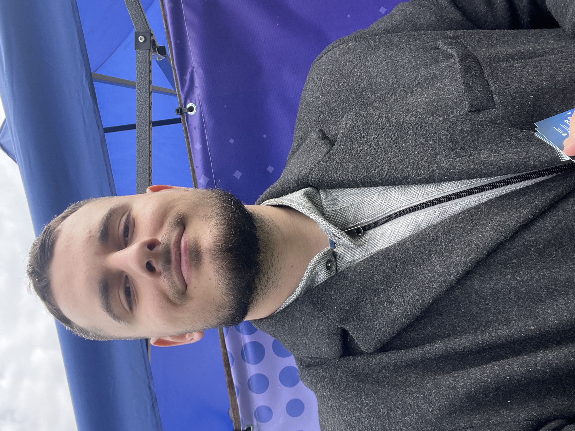 A medium indoor shot shows a fair-skinned male with dark hair, a trimmed beard, and a slight smile. He is wearing a gray wool coat over a gray and white textured collared shirt with a zipper. He appears to be holding something blue and white in his right hand. A blue canopy or tent with a metallic frame is visible above and behind him. The backdrop is a blue and purple curtain-like material with a geometric pattern. There is no indication of the location in Burgas, Bulgaria.