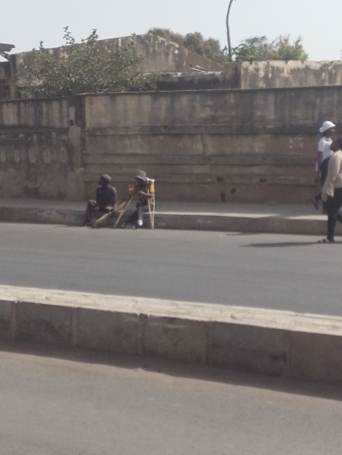 This image depicts a daylight street scene in Jos, Nigeria. In the foreground, a low, light-colored concrete curb separates the viewer from a grey asphalt road. Along the right side of the road, a concrete sidewalk runs parallel to a tall, weathered concrete retaining wall. On the sidewalk, to the left, two individuals are present. One individual, wearing dark clothing, is seated directly on the ground, leaning forward and appearing to work with a bundle of light-colored, thin, elongated objects. Adjacent to them, another individual is seated on a light-colored chair. This person wears a hat and a light-colored top with a yellow element, also seemingly engaged with similar elongated objects. Further to the right on the same sidewalk, two other individuals are walking from left to right. One individual wears a white hat and a white shirt. The other individual, partially obscured, wears a light-colored long-sleeved shirt and dark trousers. The concrete retaining wall behind the sidewalk is textured and exhibits discoloration. Above and behind the wall, green foliage is visible, with some branches extending over the wall. In the background, a light-colored, possibly dilapidated building or structure with an uneven top edge can be seen. The sky above is bright and clear, and a dark, curved streetlamp or utility pole is visible extending upwards on the right side of the background. Shadows are cast by the curb, people, and objects, indicating bright overhead sunlight.