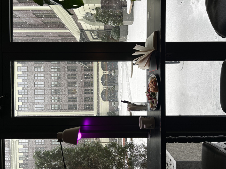The image depicts an indoor scene looking out through a large window during a snowfall in Dnipro, Ukraine. A dark, narrow counter, likely a window bar, extends across the lower third of the frame. On the counter, from left to right, rests a light-colored mug, a clear glass container holding cutlery and white napkins, and a white plate presenting a meal consisting of a green salad, a pastry item, and a small white dish. To the right of the plate, an open book with numerous pages visible lies face down on the dark surface. A lamp with a light-colored conical shade, emitting a distinct purple light, is positioned to the far left. Partial views of two dark chairs or stools are visible beneath the counter. Outside, heavy snowflakes are actively falling and accumulating, covering the ground, trees, and various outdoor elements in white. The scene is a pedestrian courtyard or plaza surrounded by multi-story buildings constructed primarily of dark brick. Directly opposite the window, a building features multiple rows of uniformly sized rectangular windows and arched ground-floor entrances. To the right, another brick building displays classical architectural elements with light-colored cornices and window surrounds. A sign on this building reads "DREAM SPACE" with additional text below, and a traditional wall-mounted lantern is visible beside it. Snow-dusted evergreen trees and planted shrubs are scattered throughout the outdoor area. The specific location, indicated by the "DREAM SPACE" signage and correlating architecture, is the area around the Dream Space coworking center, situated at Sichovykh Striltsiv St, 16, in the city of Dnipro, Ukraine.