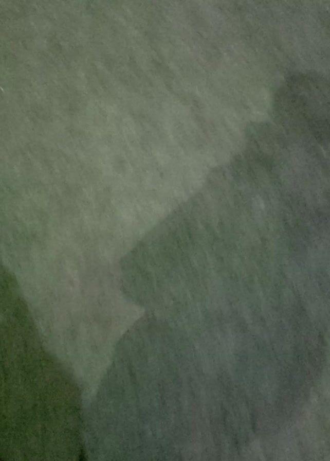 person's foot wearing a pink and blue flip-flop walking on artificial green grass. The lighting is dim, and the camera angle is from a low perspective, focused on the ground. There's also a shadow cast onto the grass, but the source of the shadow is unclear.