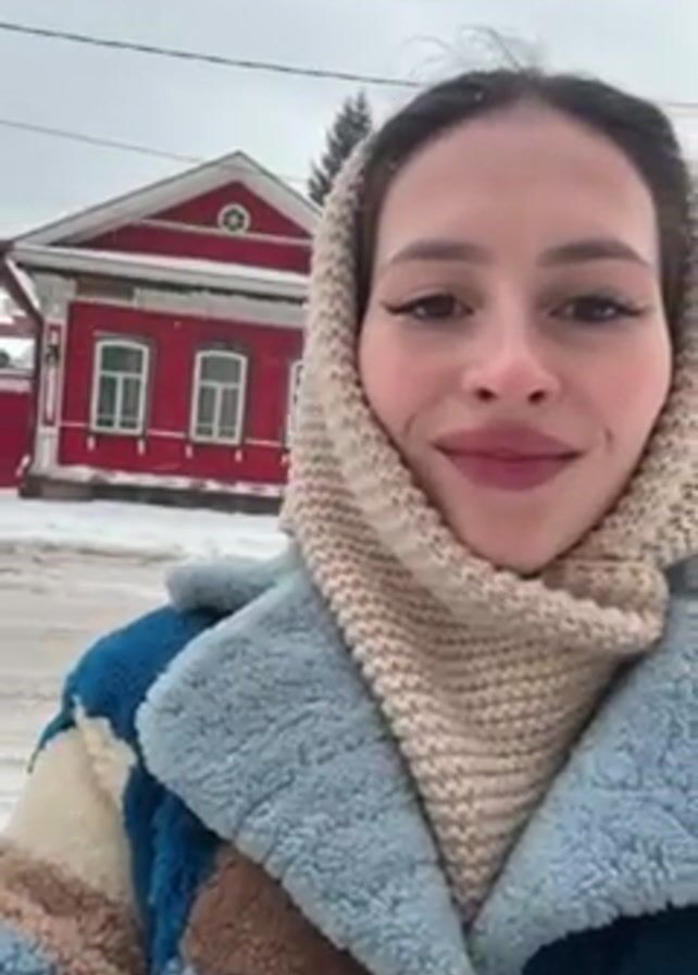 A woman is standing outside in a snowy environment, facing the camera. She is wearing a colorful patchwork jacket, a neutral-colored knitted scarf wrapped around her head and neck, and has visible makeup on. Behind her, a red wooden house with white-framed windows is partially visible. Snow is on the ground, and the sky appears overcast. A car drives into the frame behind her to the left. The woman smiles into the camera.