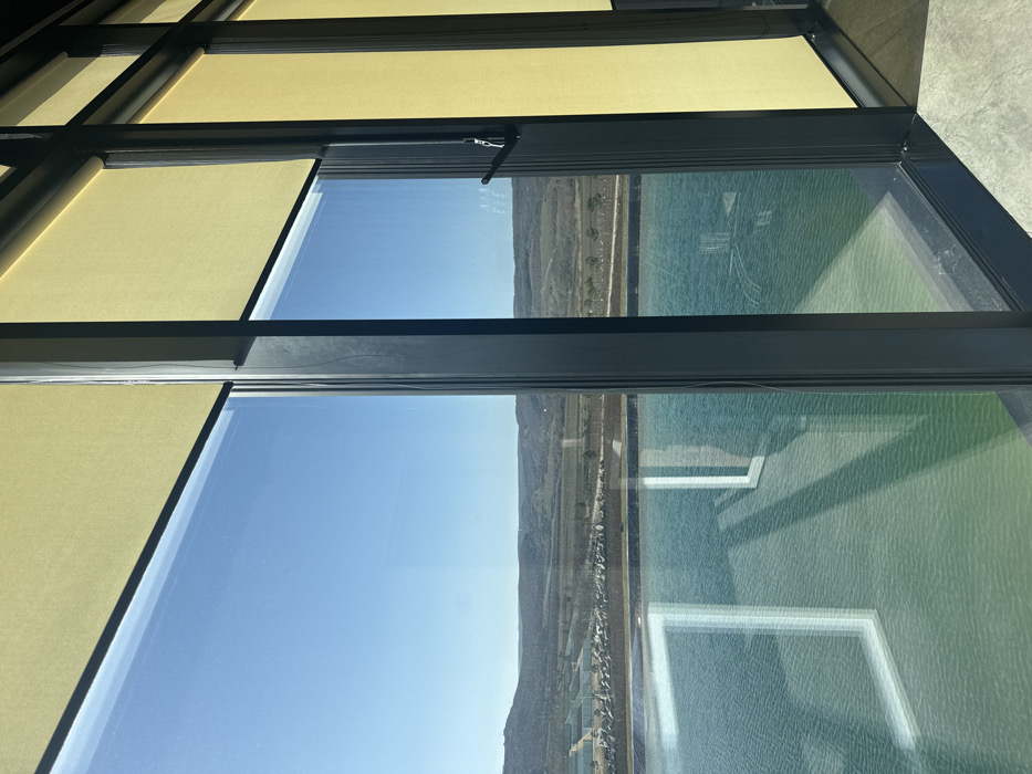 The image depicts an exterior view through a series of large, multi-pane windows with dark frames, partially obscured by light yellow roller blinds positioned at the top of each pane