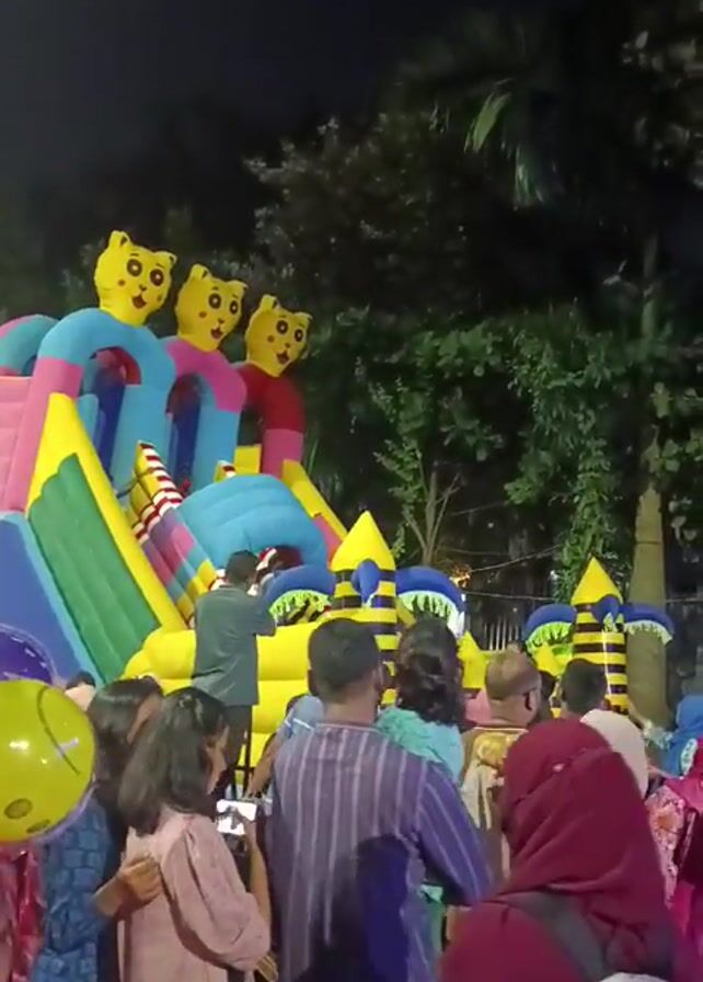A crowd of people gathers in front of an inflatable bounce house at night. The bounce house is brightly colored, featuring cartoon cat faces. People are standing around, some looking at the bounce house, some taking pictures. The scene is illuminated by artificial lights. In the background are trees and other structures. The crowd consists of people of different ages and genders, many wearing casual clothing. The camera moves slightly, showing different parts of the scene. Loud music can be heard.