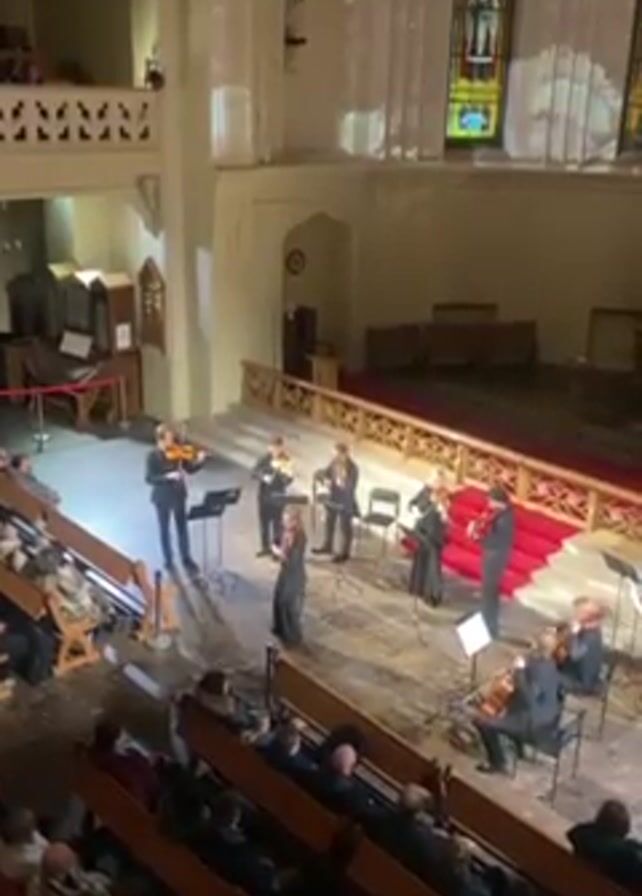 From an elevated perspective inside a church, a string ensemble of approximately eight musicians performs for an audience seated in pews below
