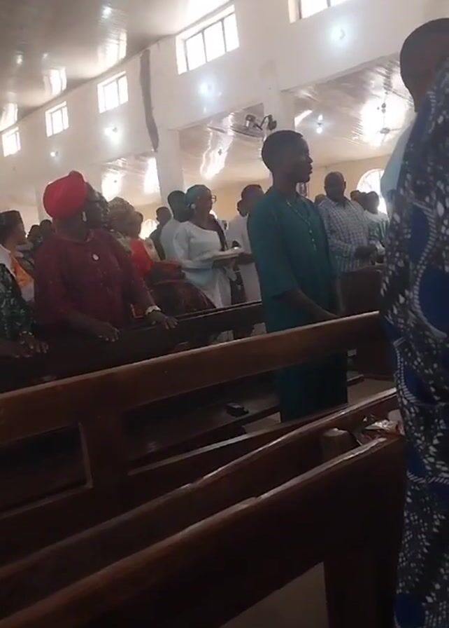 inside of a church, with rows of wooden pews occupied by a diverse group of people. Most of the individuals are standing, seemingly participating in a service or song. Many wear traditional African clothing, with some women donning headwraps. The church has white walls and a high ceiling lined with fluorescent lights. Windows are placed high up on the walls, letting in natural light. The perspective is from behind, looking towards the front of the church.