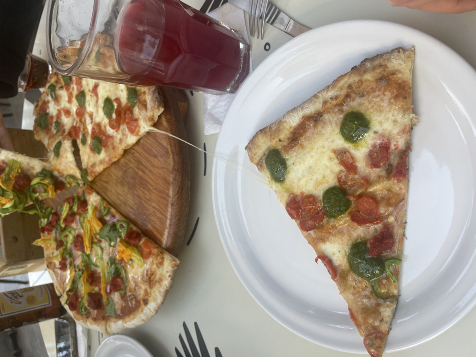 - "A slice of pizza sits on a white plate, adorned with mozzarella, tomato, and pesto" by FM-nvaX33, licensed under CC BY 4.0