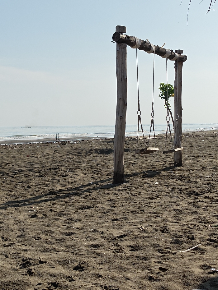 The image depicts a static scene on a sandy beach in Reudeuep, Indonesia, under a clear, pale blue sky. In the foreground, a rustic, homemade swing set is constructed from three debarked wooden logs. Two vertical logs are embedded in the dark, coarse sand, supporting a horizontal log secured by white fabric or rope wraps. Two individual wooden-plank swings hang motionless from ropes attached to the horizontal beam. A small green plant or branch is visible near the base of the right vertical post. The sandy beach, exhibiting numerous depressions and scattered small debris, extends towards the ocean. Long shadows from the swing set are cast to the left across the sand. Near the water's edge, small waves are breaking, and a line of dark detritus is visible along the tideline. A thin, vertical stake-like object is partially submerged in the shallow water to the left of the swing set. In the distant background, a large, dark vessel, possibly a ship, is visible on the ocean surface, emitting a faint plume of smoke or spray, accompanied by a smaller, darker object closer to the shore. No individuals are present within the frame.