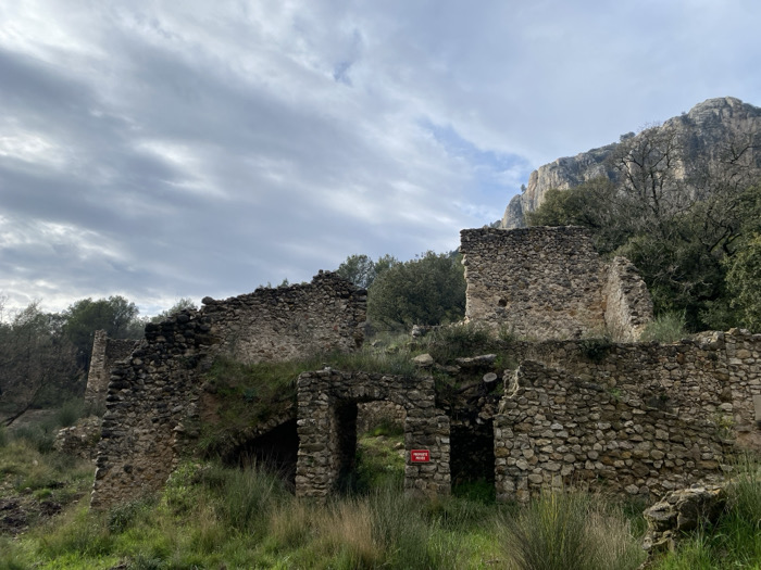 The image depicts multiple stone ruins located in Mérindol, France, under an overcast sky. The ruins consist of partially collapsed structures made from rough-hewn, irregular stones, forming walls of varying heights. Green grass and shrubs densely cover the ground surrounding and within these structures. Trees with both bare branches and green foliage are visible behind the ruins and along the left side of the frame. A prominent, sheer rock cliff face rises in the upper right background. Within an arched opening of one of the foreground ruined walls, a small red rectangular sign with white text, partially legible as "PROPRIÉTÉ PRIVÉE," is affixed. No individuals or active subjects are present. The sky is filled with layers of grey clouds.