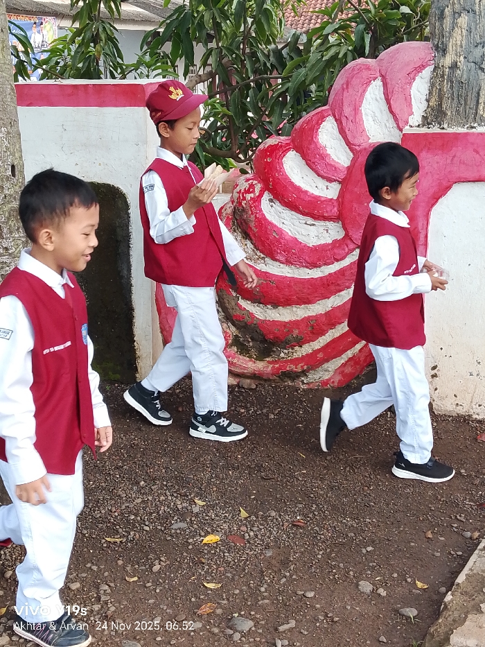 Three boys in school uniforms walk outdoors. The uniforms consist of white shirts, maroon vests, and white pants. The boy in the middle wears a maroon cap. They are near a white and red painted structure. The ground is covered in gravel. The image has a timestamp and device information in the lower left corner.