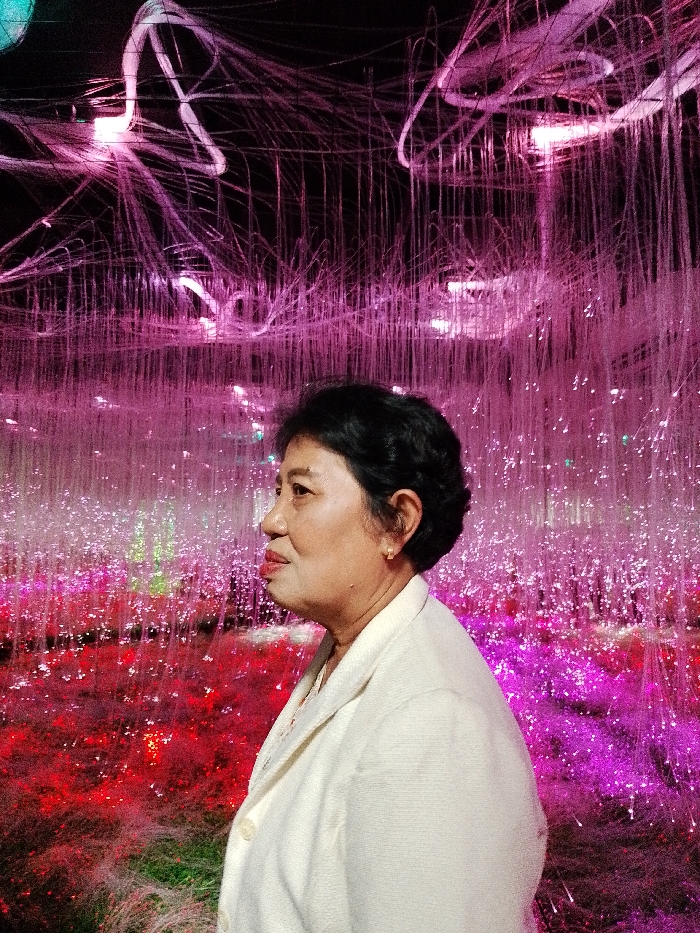 An adult female, positioned in the lower right and center of the frame, is depicted in left profile against an illuminated art installation