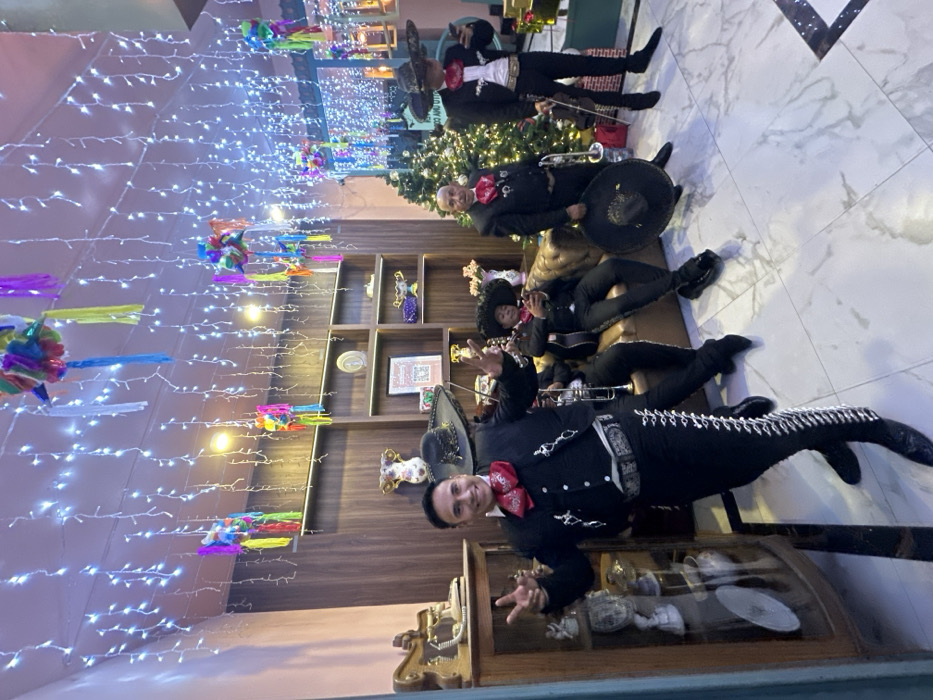 A mariachi band of five people is posing indoors. All wear black suits with white detailing, sombreros, and red bow ties. The man in the foreground is holding a trumpet and gesturing with his hands. Another man, seated on a couch, is playing a guitar. One of them is playing a trumpet and another a violin. A Christmas tree is visible behind them. String lights and colorful papel picado hang overhead. A display case and shelves with objects are behind the band. The floor is marble.