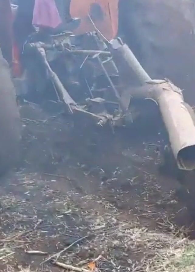 A small orange tractor is shown from the rear, pulling a single-disc plow through a muddy field. The plow is making a furrow in the ground as the tractor moves forward. A man wearing a red shirt is partially visible on the left side of the frame. Several trees are standing in the field behind the tractor, and a section of concrete wall is visible in the background. The sky is overcast, and there is smoke or fog in the air.