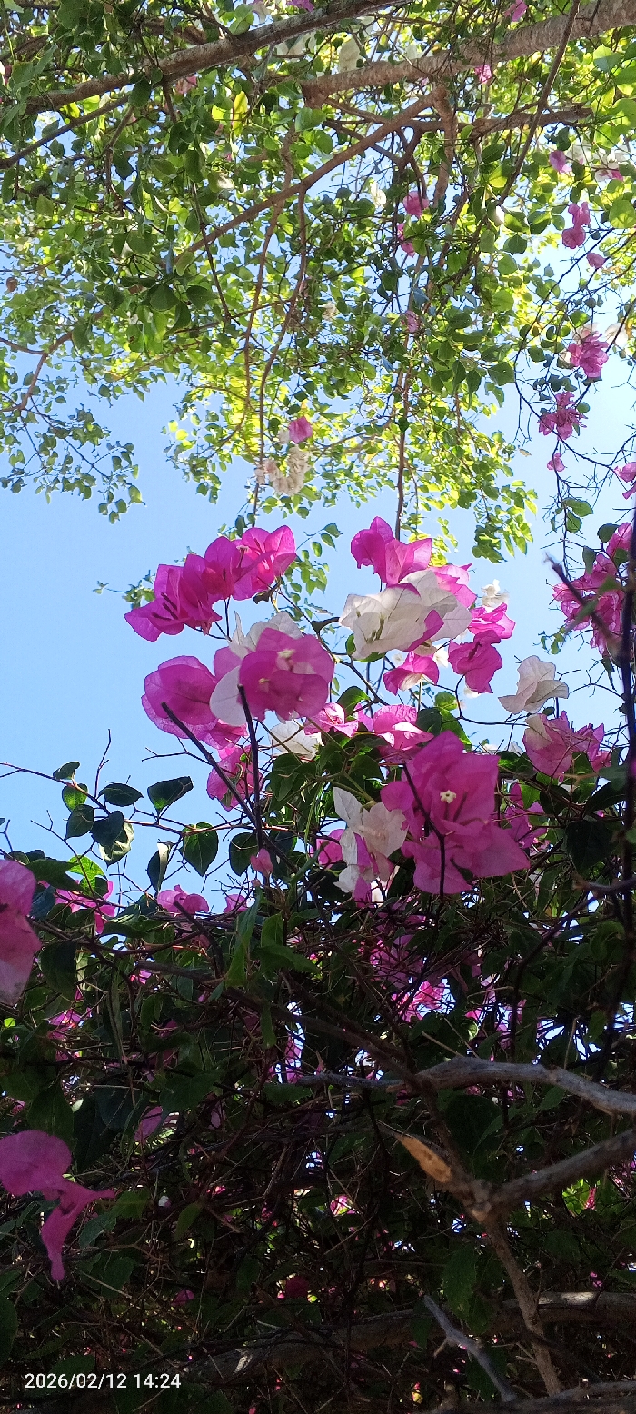 A vibrant display of pink and white bougainvillea flowers fills the view, set against a clear blue sky. Green leaves and branches intermingle with the blossoms, creating a lush, natural canopy. The low angle shot emphasizes the upward reach of the plant towards the sunlight. The time stamp indicates the image was taken on February 12, 2026, at 14:24.
