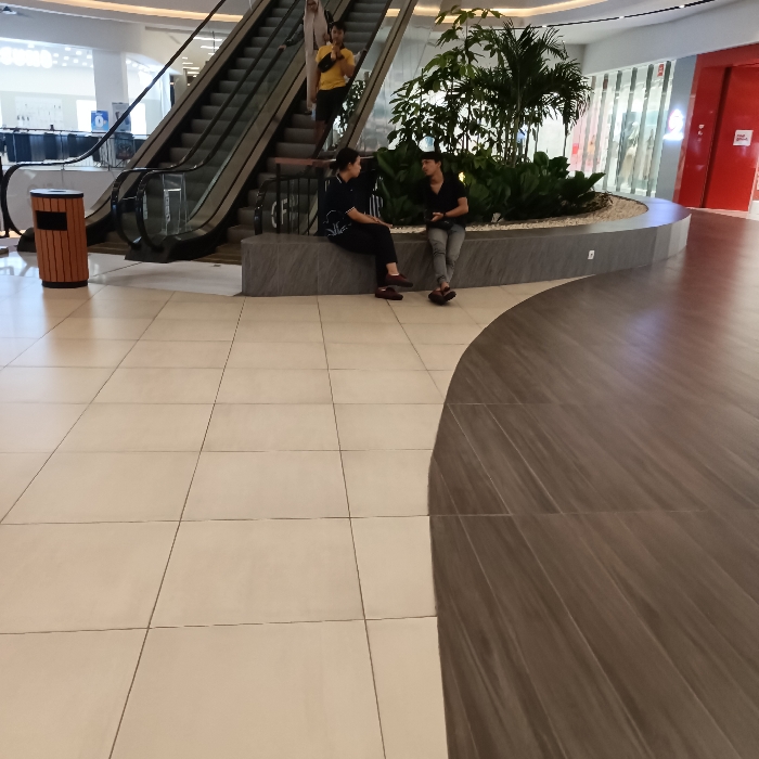 The scene is located in a mall in Kecamatan Mijen, Indonesia, at the coordinates -7.045 latitude and 110.324 longitude. There are two men and one woman sitting on a bench. The woman is wearing a black shirt and black pants. The two men are both wearing light colored shirts and pants. The woman and one of the men are talking. There is an escalator behind them and a trash can in the foreground. The floor is tiled and there is a planter in the background. The surrounding environment appears to be an indoor shopping mall.