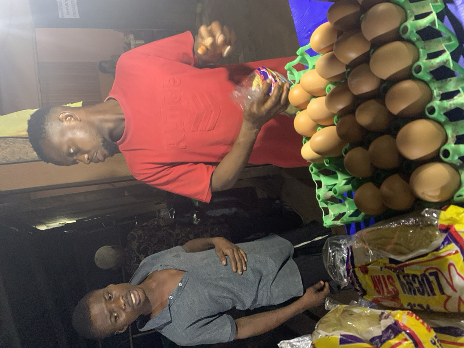Two young men are shown in a dimly lit outdoor scene. One is in a red t-shirt, holding a packaged item next to trays of eggs. The other is in a grey button-up shirt. A "Lucky Star" labeled package is also visible. The scene appears to be a small market or roadside shop.