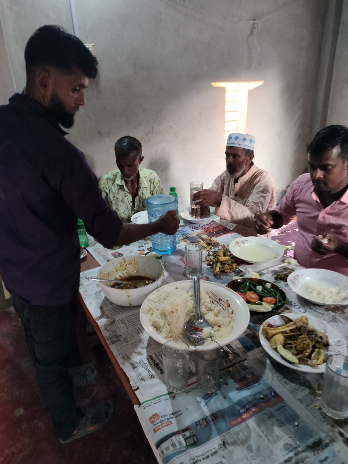 group of four men seated around a table covered in a white tablecloth with newspapers underneath, eating a meal together. The scene takes place inside a home in Lalmohan, Bangladesh. The men are all dressed casually. The man standing is wearing a blue shirt and holding a pitcher of water. He is pouring water into a glass on the table. The man seated in front of him is wearing a white shirt and a white cap. He is holding a glass of water in his right hand. The man seated on the left side of the table is wearing a blue shirt with stripes and holding a blue pitcher. The man on the right side of the table is wearing a pink shirt. There is a variety of food on the table, including rice, vegetables, and meat. There are also glasses of water on the table.