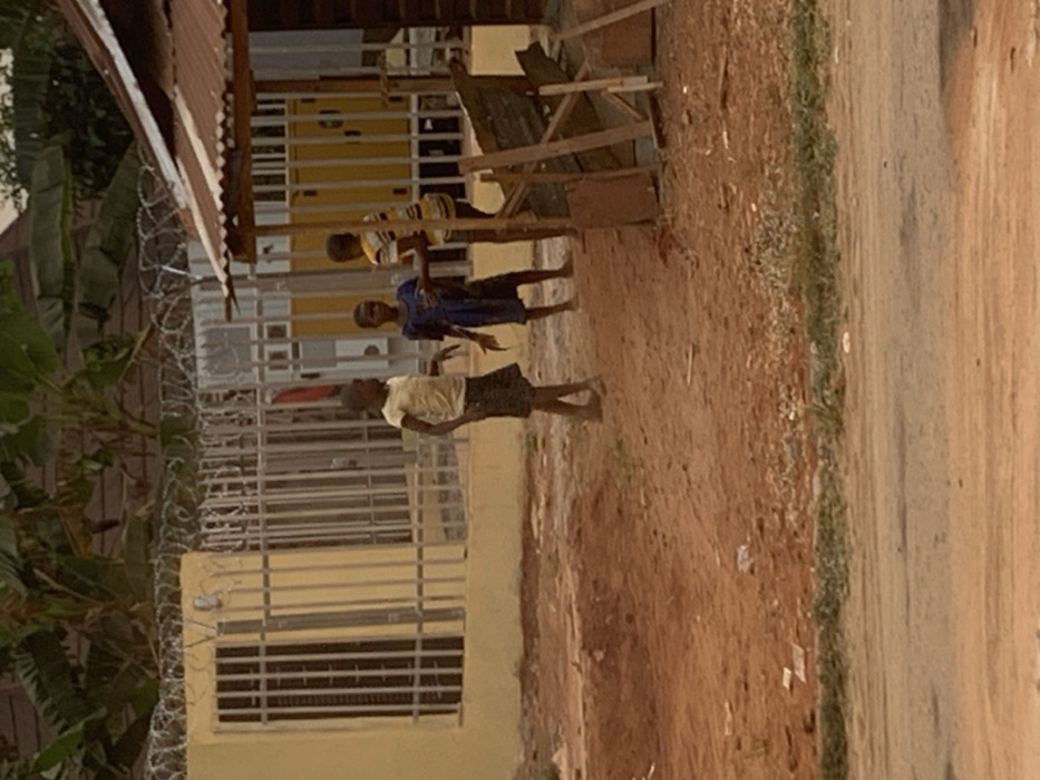 Three children play near a building with barred windows and barbed wire on the roof. One child wears a yellow shirt and black shorts, another a blue dress, and the third a striped shirt. They stand on a dirt path beside a paved road. To the left, a banana tree and part of a brown roof are visible.