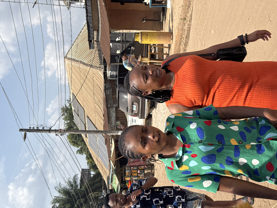 An outdoor scene in Ihiagwa, Nigeria, depicts a bustling, unpaved street or market area under a bright, cloudy sky. In the foreground, two women walk towards the viewer, from left to right. The woman on the left wears a green short-sleeved collared shirt patterned with blue, white, yellow, and red irregular shapes, and has braided dark hair. The woman on the right wears an orange sleeveless ribbed dress, has braided dark hair, and carries a black shoulder bag on her left side; her mouth is slightly open. A man is partially visible behind the first woman on the far left, wearing a dark patterned shirt and shorts, looking downwards. In the midground, a brown SUV is parked on the right. To its right, a man is partially visible leaning over a surface, adjacent to a tall, yellow gas cylinder standing upright. Behind the people and vehicles, several commercial structures with corrugated metal roofs are visible. One prominent building features a light brown corrugated roof equipped with multiple dark solar panels. A tall wooden utility pole, heavily laden with numerous overhead electrical wires, stands centrally in the background. Dense green foliage and other buildings are visible beyond the structures. The ground beneath the individuals is a light brown, unpaved dirt surface.