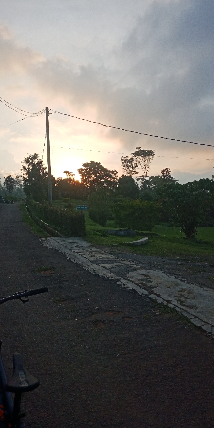 The image depicts an outdoor scene in Ciherang, Indonesia, at either sunrise or sunset. The lower portion of the frame is dominated by a dark asphalt road with visible cracks and potholes. On the far left, parts of a bicycle, including the handlebar and a black "BATE" branded seat, are visible, suggesting the viewpoint is from a cyclist. Adjacent to the road on the right is a paved, potentially concrete, pathway leading into a well-maintained grassy area. A tall, dark utility pole with multiple electrical wires extends across the upper mid-ground. To the right of the road and pole, a lush green landscape features manicured bushes, various trees, and open grassy patches. A small, rectangular blue-green sign with white, partially legible text, possibly reading "KEUT LINGKUNGAN," is embedded within the hedge line. Further into the grassy area, a low, curved concrete or stone barrier is present. In the background, the sun is low on the horizon, its intense orange-yellow light filtering through a dense cluster of trees, creating silhouettes. The sky is overcast with a mix of grey and lighter clouds, transitioning from warm tones near the horizon to cooler greys and blues higher up. On the far left, a dirt or unpaved road ascends into the distance, with a dark motorcycle faintly visible. No people are present in the scene.