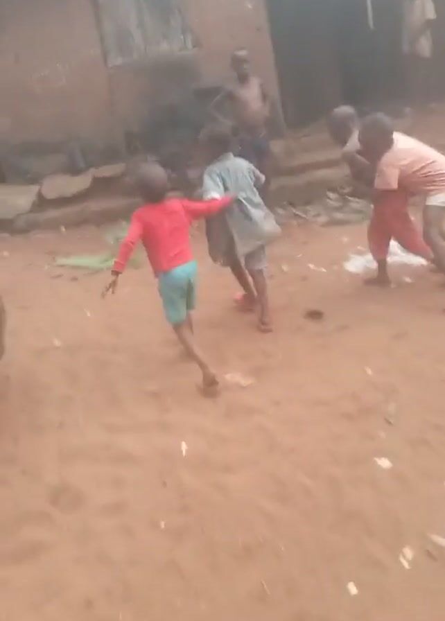group of children playing in a sandy, outdoor area. Several of them are engaged in a piggyback ride, while others stand around watching. Some children are shirtless. In the background, there are simple dwellings and a clothesline with clothes hanging to dry. A silver car is parked nearby. The environment appears to be a rural or less developed setting.