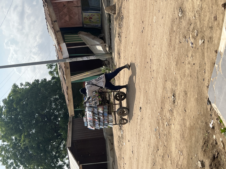 An outdoor scene in Ngleshi Amanfro, Ghana, depicts a male individual pushing a mobile merchandise cart on an unpaved dirt path under a partially cloudy sky