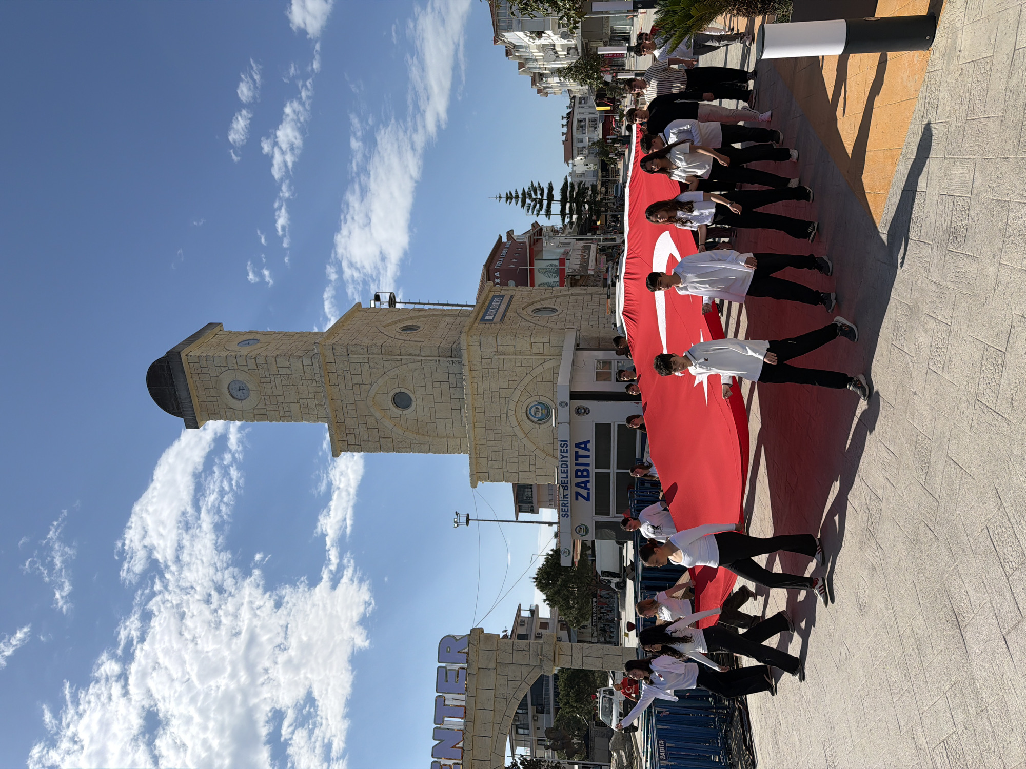 A full shot of a group of people holding a Turkish flag in Serik, Turkey. The people are aligned horizontally with the flag held in front of them. The flag is predominantly red with a white crescent and star. The people appear to be young, mostly wearing white shirts and dark pants. Behind the group is a building with "SERIK BELEDIYESI ZABITA" inscribed on it, which translates to "Serik Municipality Police". To the left of the building is a tall stone clock tower with a black dome. In the foreground, there's a stone archway with "CENTER" inscribed on it. The sky is blue with scattered white clouds. The ground is paved. Buildings are visible in the background behind the group of people. The angle of the shot appears slightly skewed. The shadows are cast on the sidewalk.