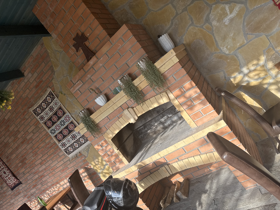 This image depicts an outdoor patio or courtyard area in Kvakhvreli, Georgia, captured from an elevated, tilted perspective during daylight hours, exhibiting strong sunlight and distinct shadows. The ground surface is composed of diverse materials, including reddish-brown brickwork laid in various patterns, transitioning to irregular light-colored flagstones with grey mortar, and sections of darker textured stone. A prominent, L-shaped brick structure, consistent with an outdoor oven or fireplace, occupies a central position. It is constructed primarily from reddish-brown bricks with alternating courses of lighter-colored brick or stone, and features an arched opening. Integrated into this structure are multiple tiered planters containing green foliage. A dark brown wooden cross-shaped ornament rests on a flat brick surface to the right side of this structure. Two patterned textile rugs are laid upon the brick ground: one larger rug displays geometric designs in black, white, and muted colors, while a smaller, darker rug exhibits red patterns. In the upper left quadrant, a black motorcycle helmet with a clear visor is visible, resting on what appears to be a black motorcycle seat. Two brown upholstered chairs are partially visible in the foreground, facing away from the viewer. A section of a dark green horizontally planked wall is discernible in the upper right background. No individuals are present within the scene.