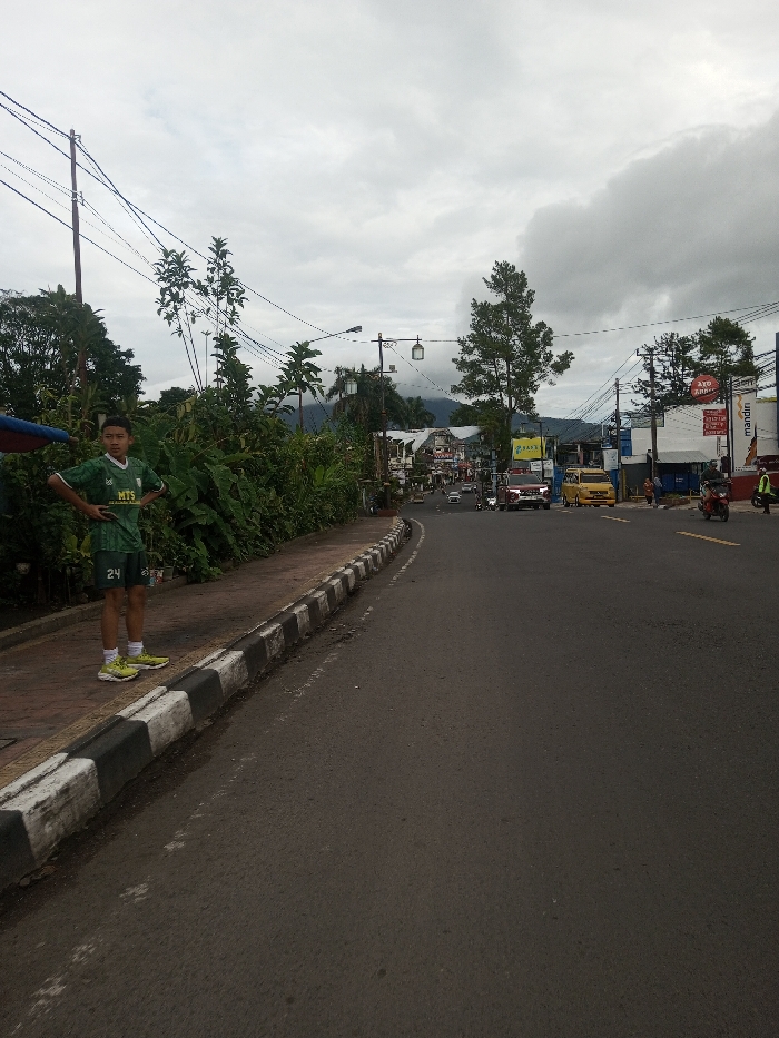 An outdoor scene in the city of Sandamal Eliya, Sri Lanka, depicts a bustling street under an overcast sky. In the immediate left foreground, a young male individual stands on a red-tiled sidewalk, his hands placed on his hips. He wears a green short-sleeved athletic jersey with white trim, displaying "MTS" and the number "24," green shorts, white ankle socks, and bright yellow-green athletic shoes. A black and white striped curb separates the sidewalk from the asphalt road. Behind the individual, dense green foliage, including large-leafed plants and trees, lines the street. Utility poles with multiple overhead wires are visible on the left and extend across the upper frame. The asphalt road, dark in color, stretches into the background, curving slightly to the left. Multiple vehicles are present on the road in the midground and distance, including a red SUV, a yellow van or minibus, and several motorcycles. Buildings with various signage, such as "AYO ANDA" and "Mandiri," line the right side of the road. Streetlights are visible above the road. Another individual on a red scooter, wearing a green vest, is partially visible on the far right. Distant hills or mountains are discernible beneath the cloudy horizon. The overall scene suggests an active urban or semi-urban environment.