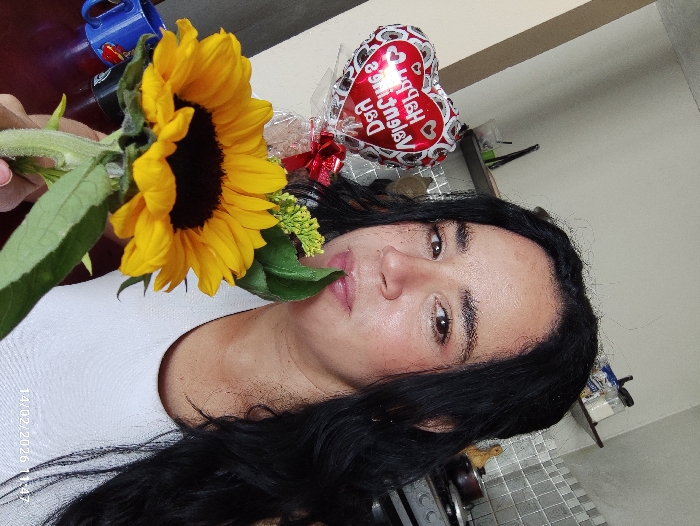 A person with long, dark hair and fair skin holds a large sunflower up to their face. The flower's yellow petals are in full bloom, contrasting with its dark center. Behind the sunflower, a heart-shaped balloon with the text "Happy Valentine's Day" is visible. The person is wearing a white shirt. The photo appears to be taken indoors, with a countertop and cabinet visible in the background. The date "14/02/2026" is printed at the bottom of the image.