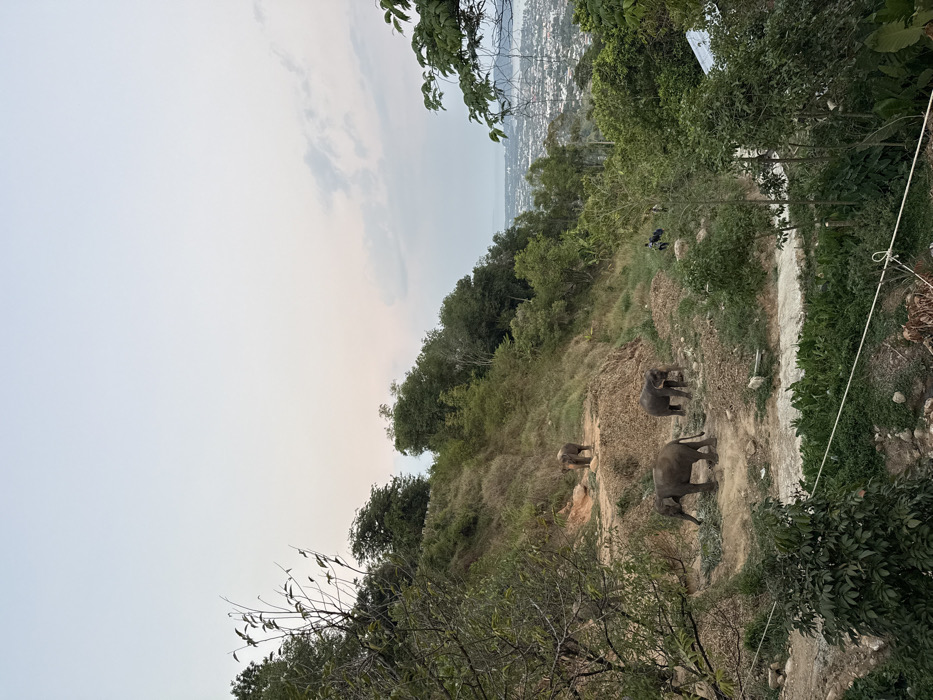 The image displays a steep, vegetated hillside overlooking the city of Chalong, Thailand, with an urban area and coastline visible in the distance under a pale sky suggesting late afternoon or early evening. Three dark-colored Asian elephants are present on the terraced dirt paths of the hillside. One elephant stands on an upper path in the midground. Two additional elephants are positioned on a lower path: the one on the left stands beside a pile of green vegetation, while the one on the right stands nearby. Two human figures are observed walking on a dirt path further down the slope, to the right of the lower elephants. The hillside is covered with dense tropical trees and shrubs, interspersed with exposed reddish-brown earth and paths. A horizontal white line, possibly a rope or wire, traverses the bottom foreground. In the background, the sprawling urban landscape of Chalong features numerous buildings and infrastructure, extending to a body of water with distant landforms on the horizon. The sky is largely clear with faint pink and blue hues.